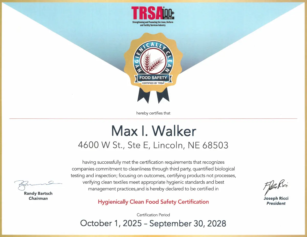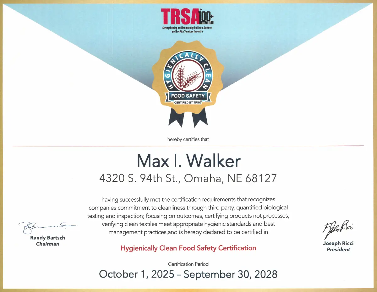 At Max I. Walker, cleanliness and safety go hand in hand. Our uniform rental service is officially Hygienically Clean Food Safety Certified by the Textile Rental Services Association.